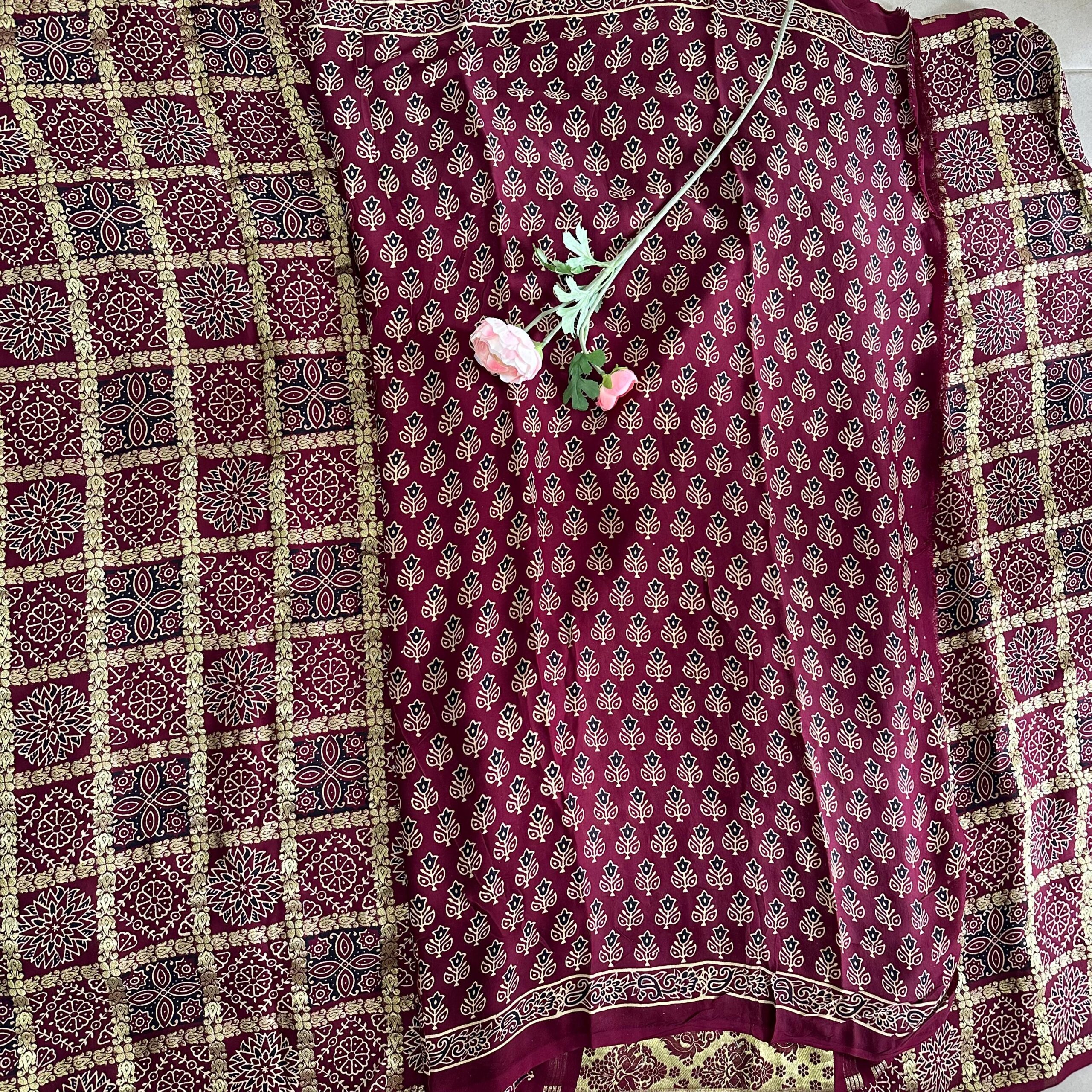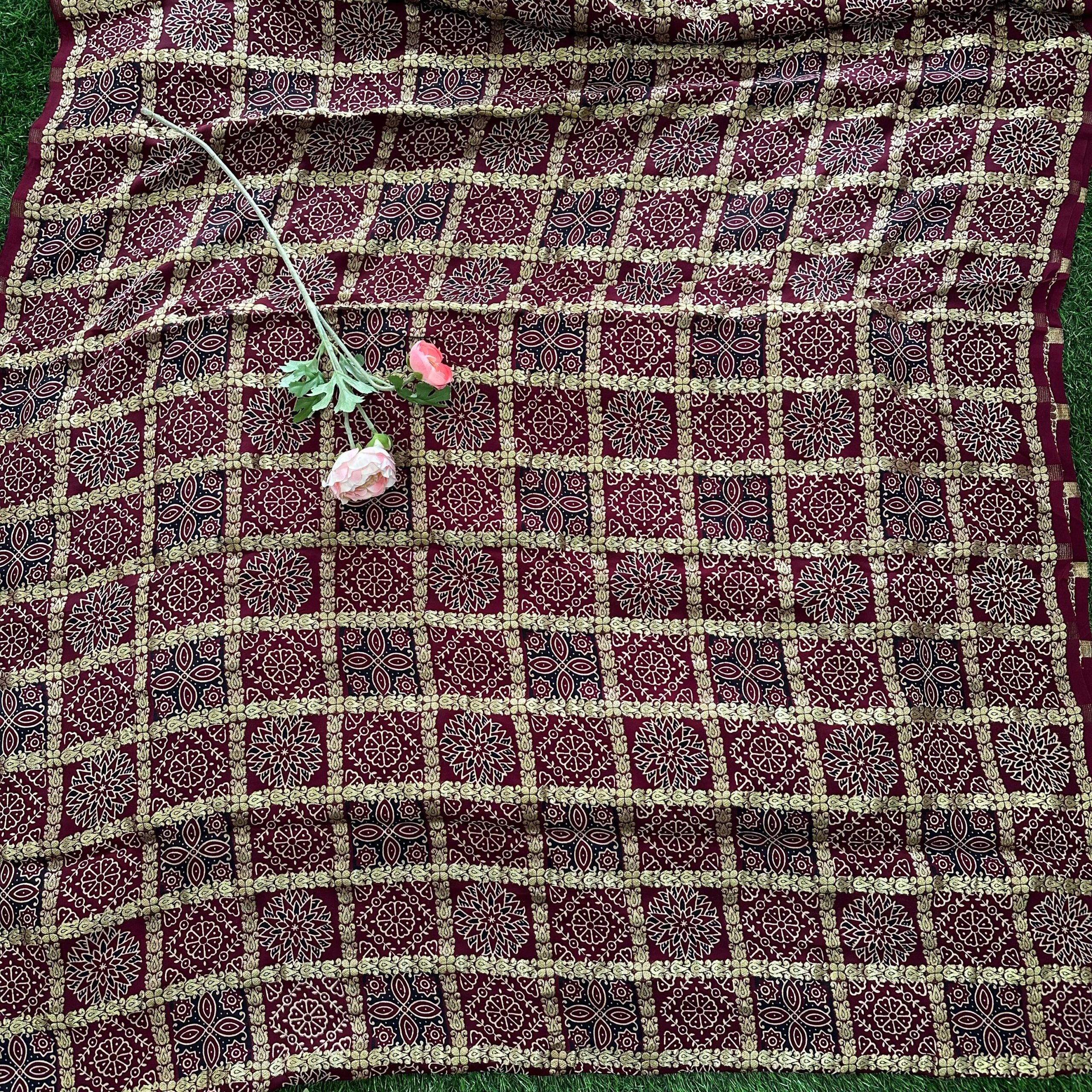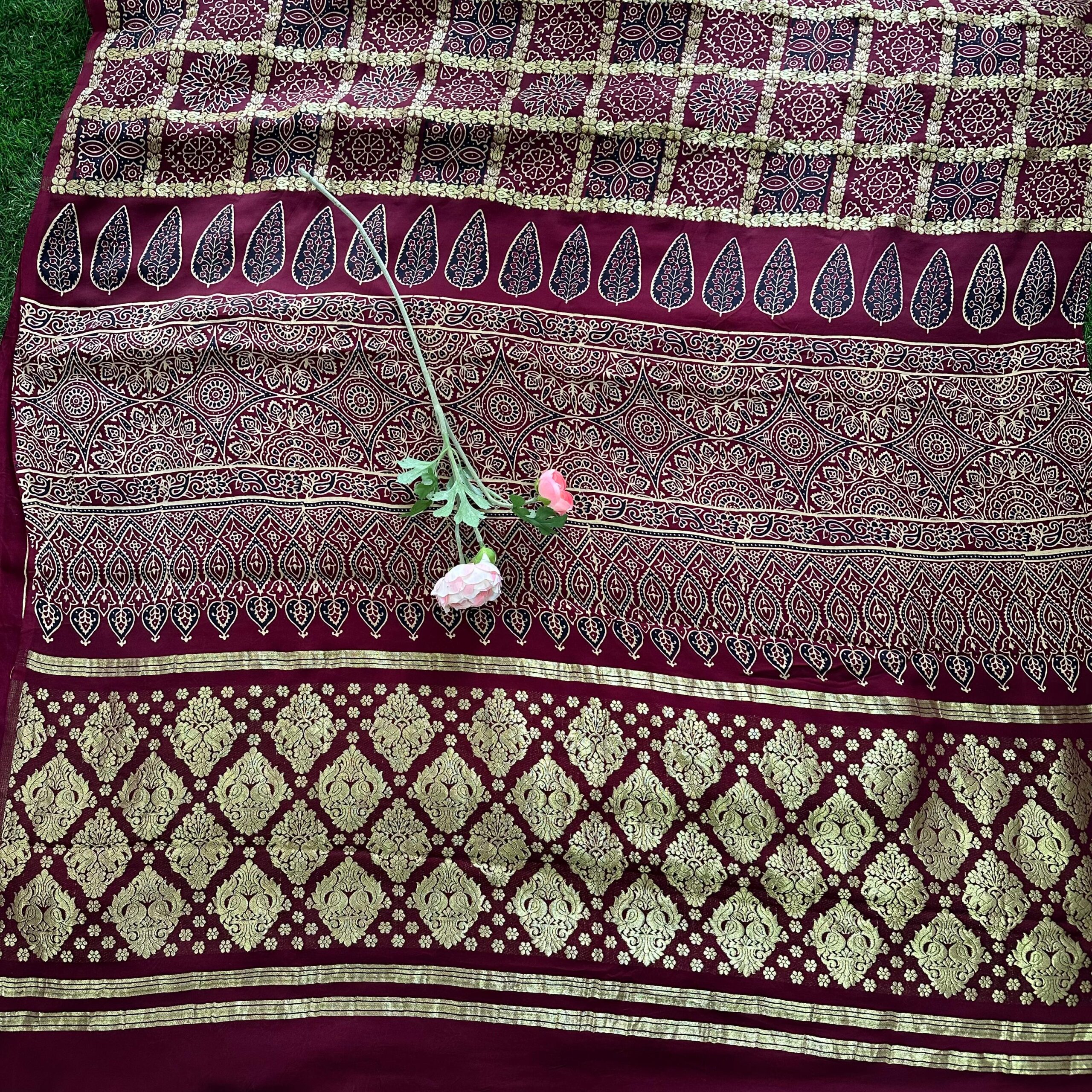 Design : Pure Modal Silk Ajrak Print Bandhini Saree Marron Colour