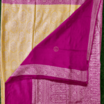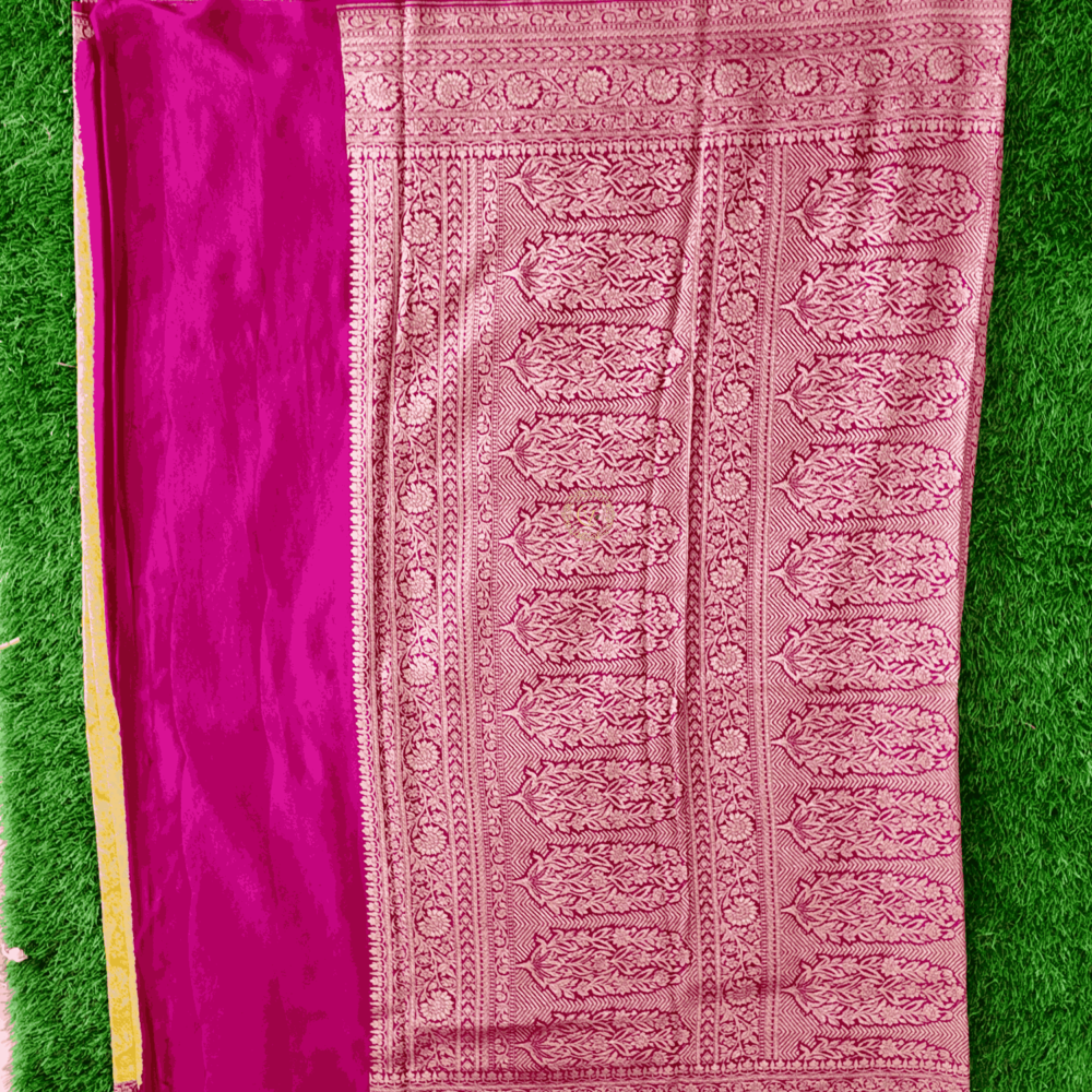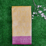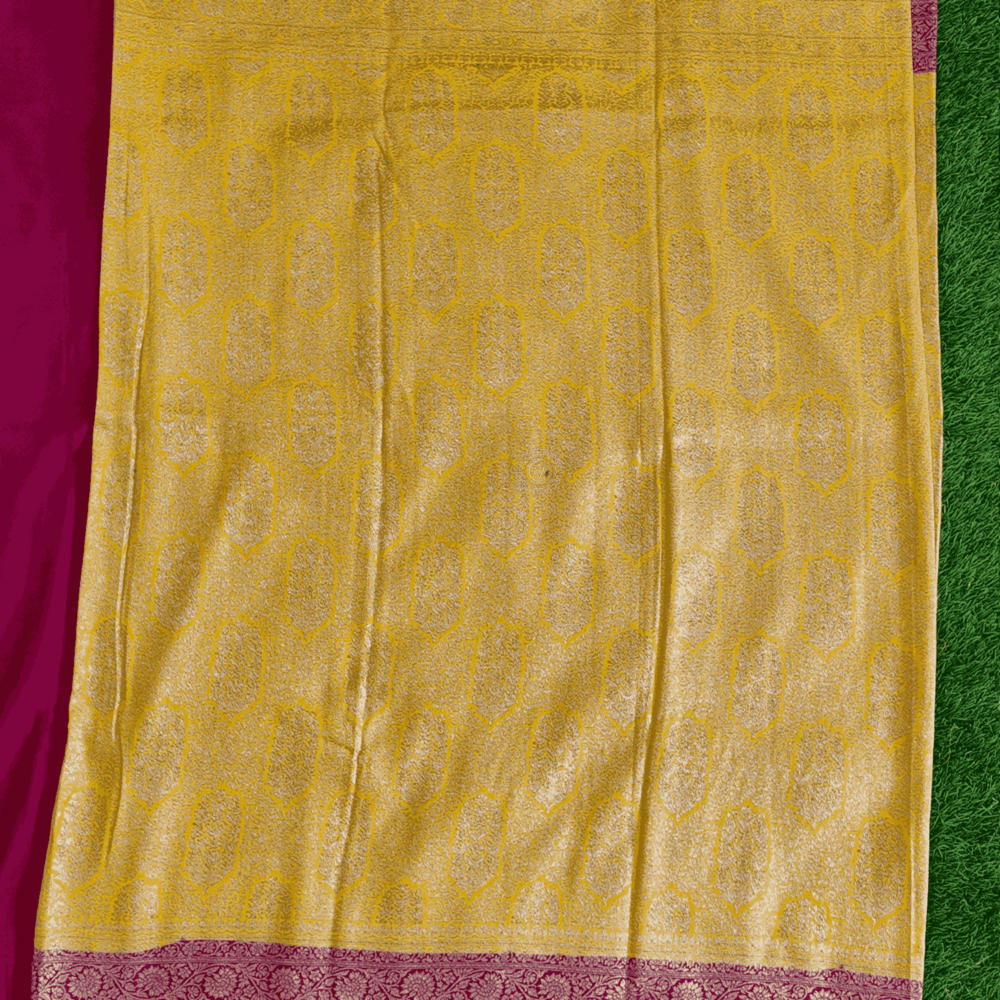 Design : Butta Pattern Pure Benars Silk Saree Mustad With Pink Contrast Colour