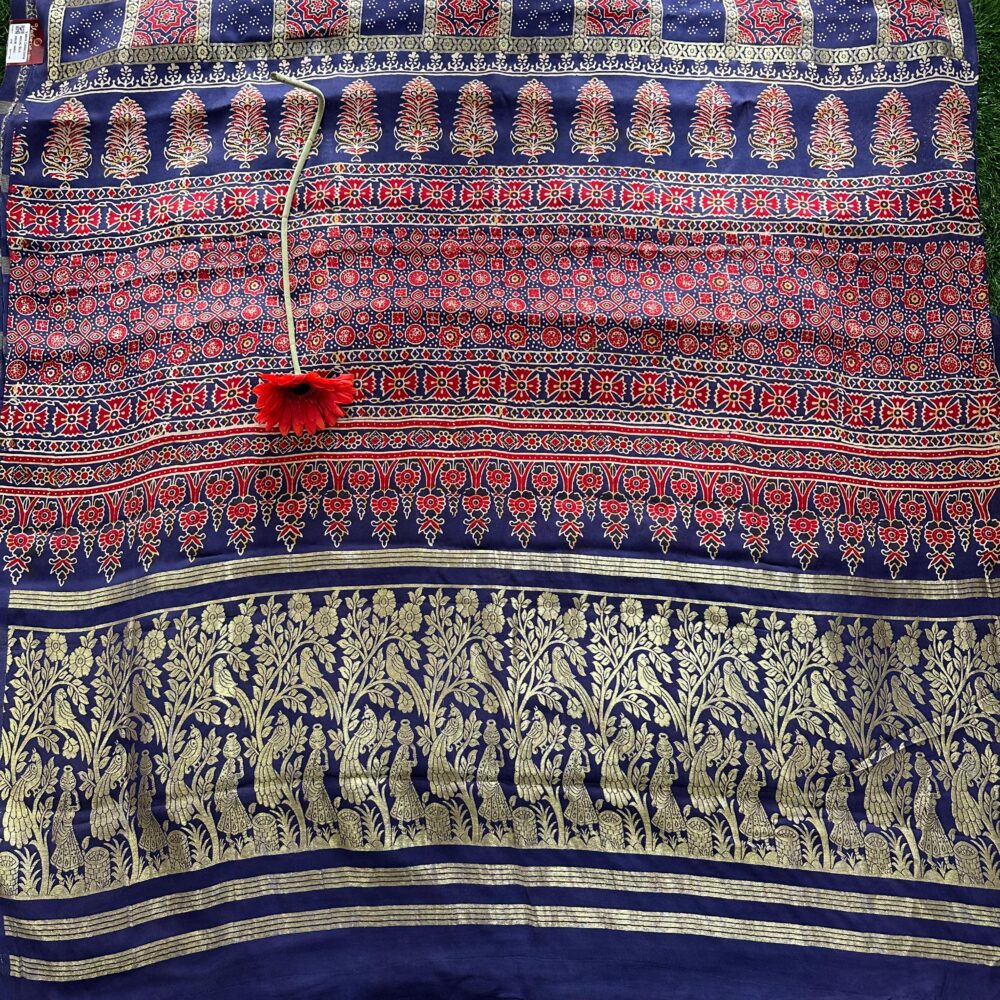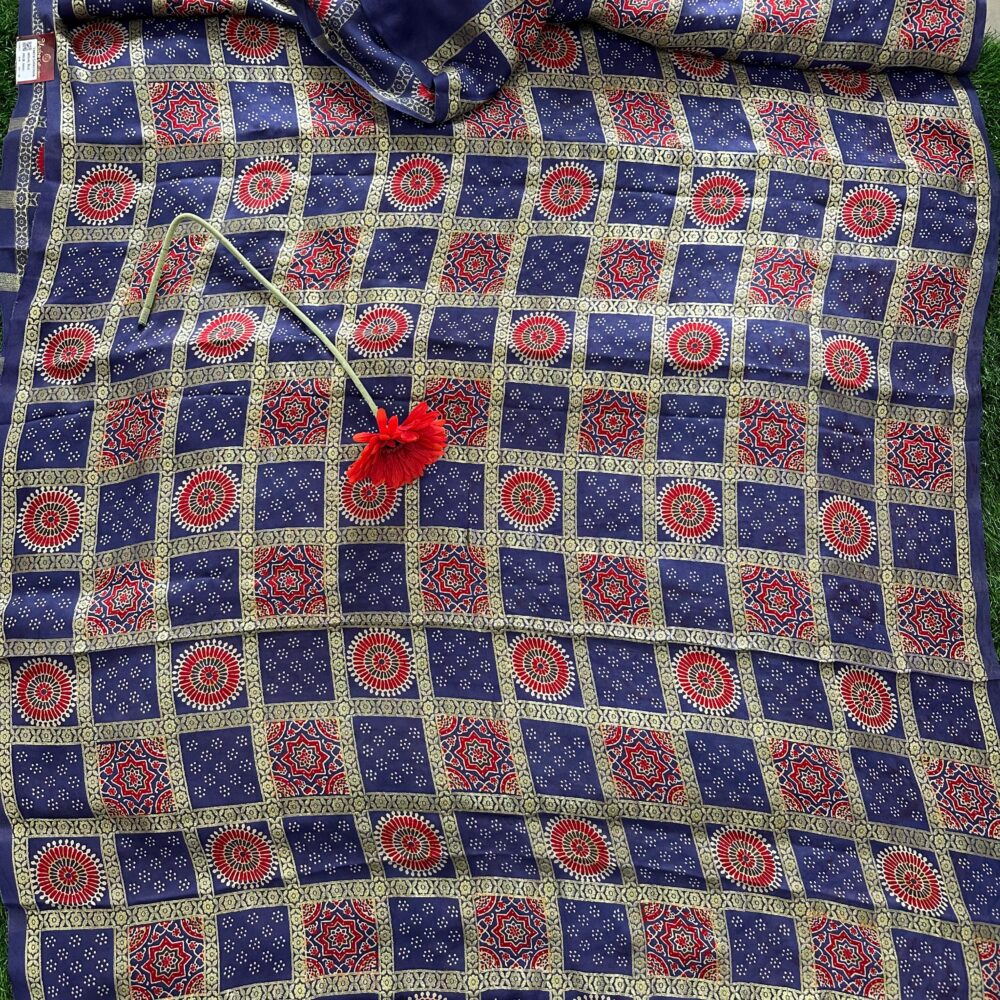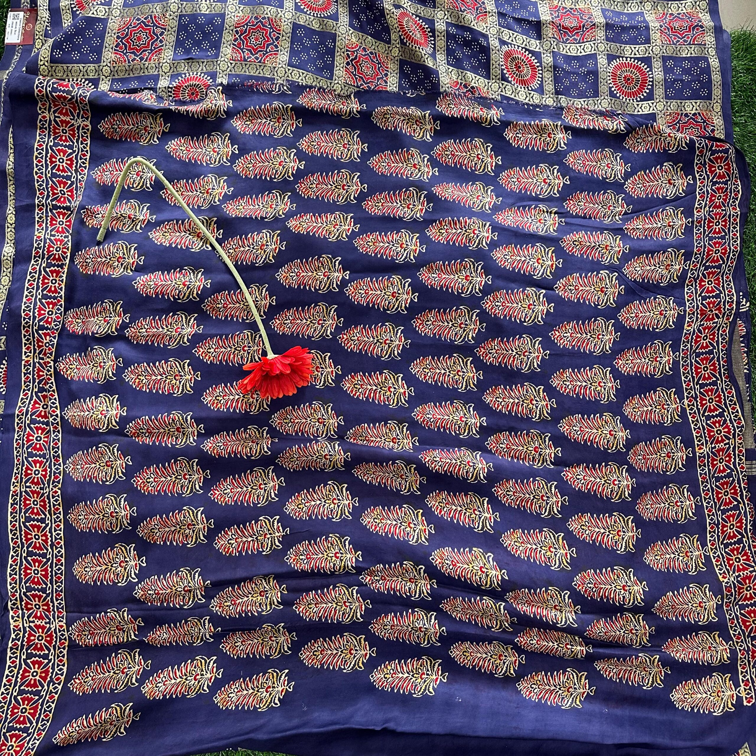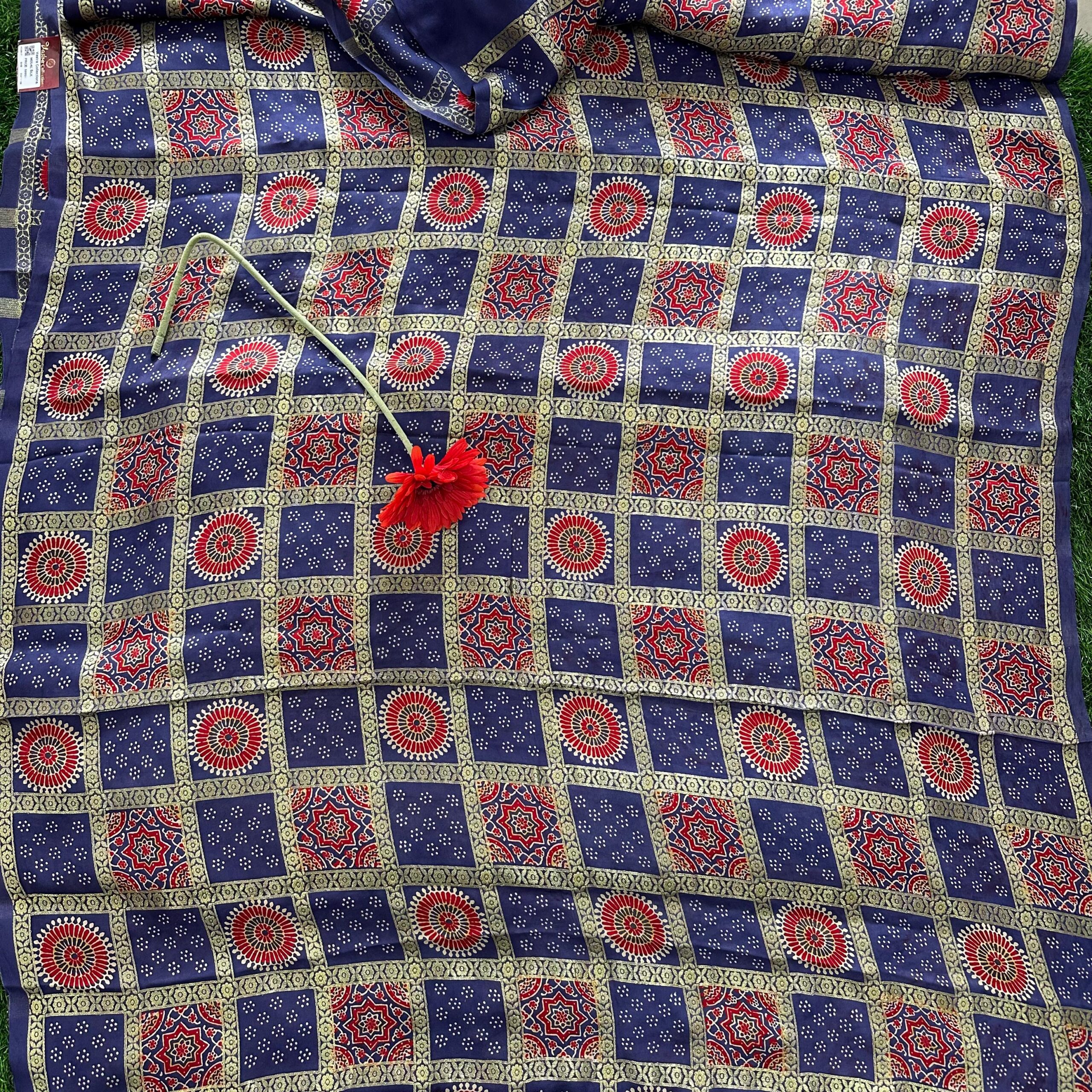 Design : Pure Modal Silk Ajrak Print Bandhini Navy Blue Saree